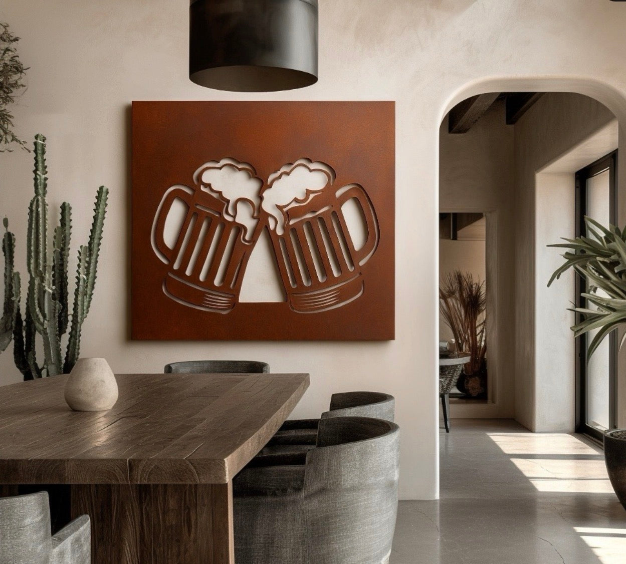 This 45x45" beer-inspired rust metal sign features precise laser cutting and a rustic, weathered finish that adds authentic character.